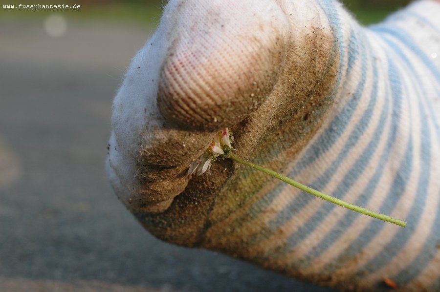 The third series is called “Nature Socks”. This time we were outside, Jutta was wearing her ‘sock order shoes’ and had some blue-white striped socks at her feet. Eventually she went around the muddy grass and her socks got really dirty. This went along with some daisies crushing in the end.